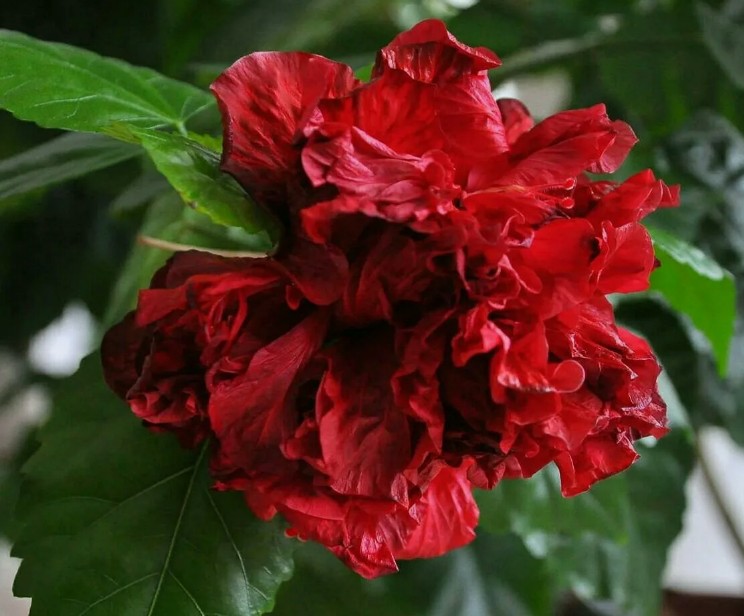 Гибискус махровый 'Гамбург' – это великолепное украшение для вашего сада или дома. Этот сорт отличается крупными, махровыми цветками насыщенного розово-красного оттенка, которые привлекают внимание своей изысканной красотой и пышностью. Листья растения темно-зеленые, глянцевые, создающие контрастный фон для ярких цветов.